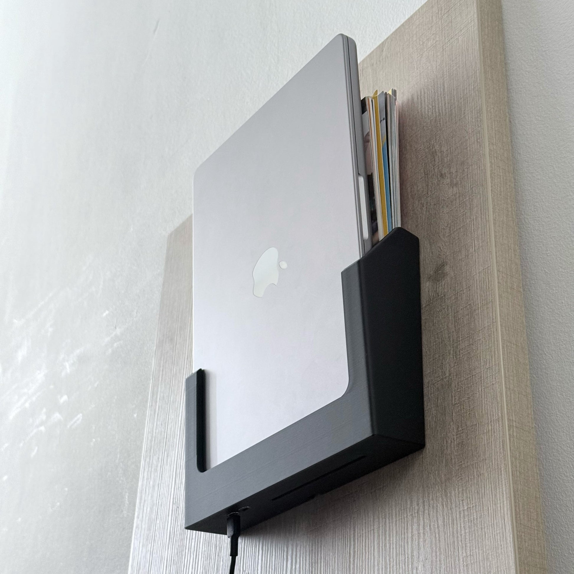 Mounted vertically, SlideWall holds your MacBook securely while turning unused wall space into structured storage.